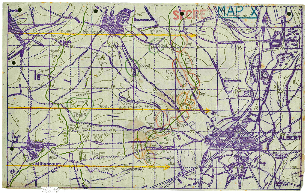 25th: Warloy: Arrived Warloy about 9 a.m. Battalion waited in a field. Left for Lavieville at 3 p.m.; intercepted at Hénencourt by Staff-Captain and ordered to stack packs and leave out surplus personnel. Brigade was ordered to take over line near Montauban[-de-Picardie]. Battalion halted just East of Albert about 9.30 p.m.-2.45 a.m. Battalion ordered to hold Ancre crossings North of Aveluy.