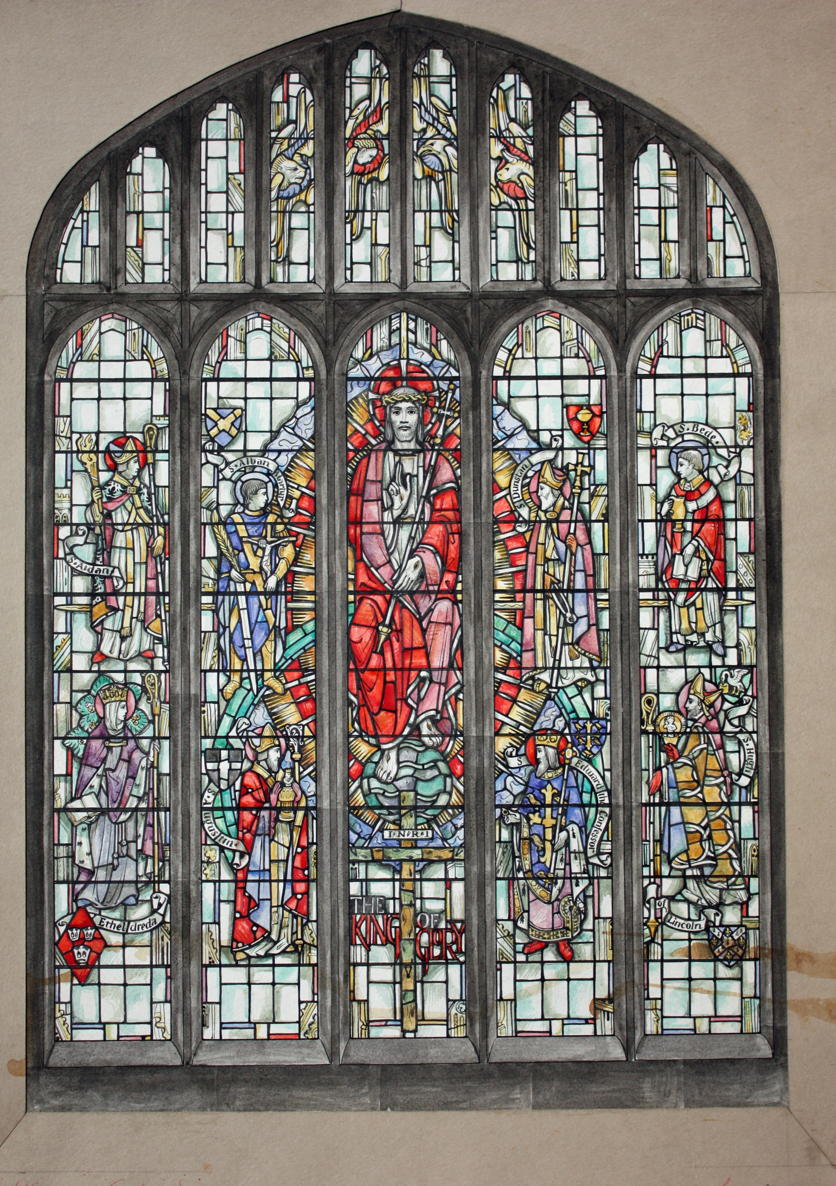 Francis Spears original watercolour for the East Window (above) was one of several that he presented to the Church for decision. He also submitted watercolours and pastels. The installation included fragments from the original window.